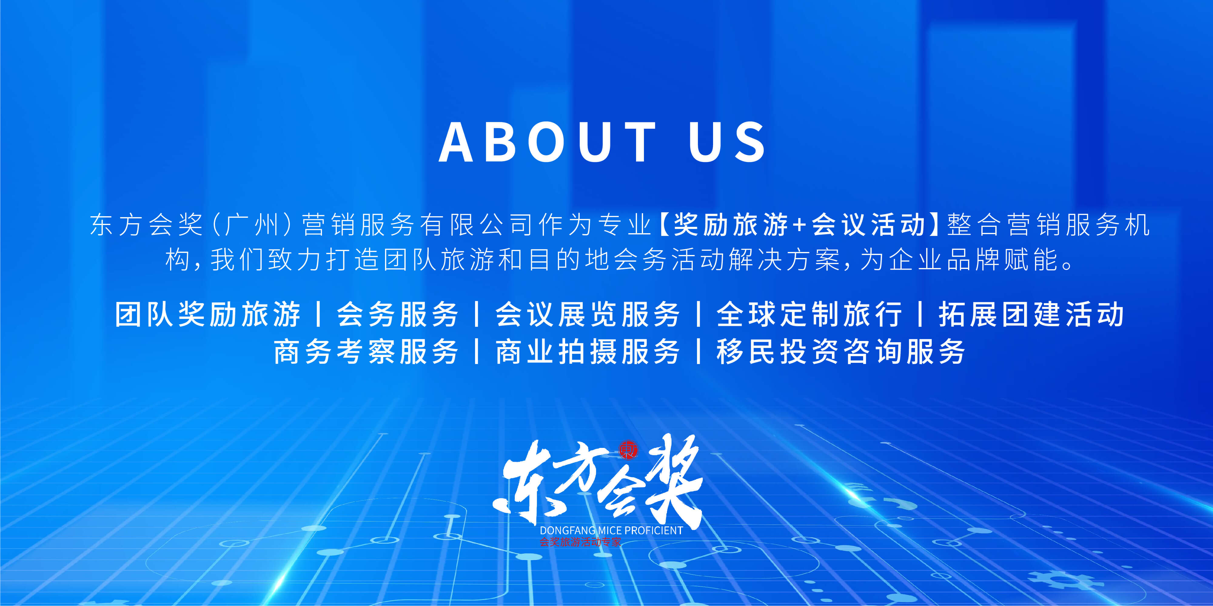 東方會獎(廣州)營銷服務有限公司 作為專業會獎旅游活動專家,我們致力打造專業團隊旅游和目的地會務會展解決方案,為企業品牌賦能。 基于對商業客戶需求的深刻理解和豐富的服務經驗,東方會獎成功實現從單一服務到整合服務、從簡單服務到高附加值服務、從線下服務到覆蓋線上線下的整合營銷服務布局,旗下東方會獎、途蘭朵旅行、左契文化、途蘭朵科技、全球開拓者等各業態的專業子公司相繼成立。目前,東方會獎已經在中國主要經濟區域建立了完善的服務網絡,覆蓋廣州、深圳、佛山、杭州、成都、貴陽、西安、福州、廈門、桂林、長沙等核心城市。 成立至今,東方會獎一直專注于為新零售、保險、金融、直銷等機構客戶提供“一站式”整合營銷服務,業務涵蓋:團隊獎勵旅游,目的地會務服務,會議展覽服務,全球定制旅行,拓展團建活動,商務考察服務,專業旅行拍攝服務。為企業品牌實現真正的全案整合營銷。